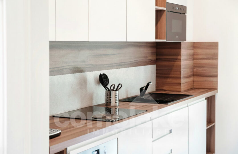 Adjacent to the living room is the kitchen, which opens onto a spacious terrace overlooking an inner garden—ideal for outdoor dining and relaxing moments.