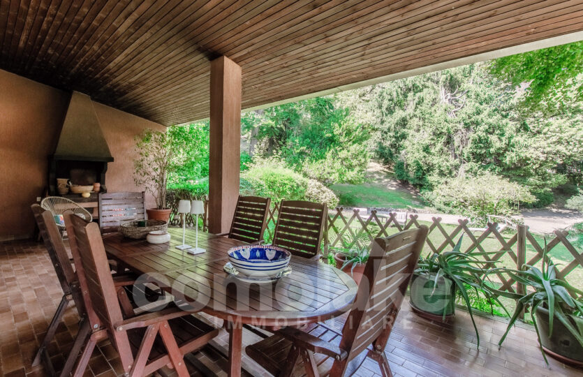 The ground floor opens into a large living area with a fireplace connected to the dining room, and a relaxing lounge facing a spacious terrace overlooking the garden. The kitchen is large and fully habitable. In the sleeping area there are two double bedrooms, a bathroom, and a master suite with a walk-in wardrobe and private bathroom. The property also includes a spacious basement, a laundry room, technical rooms, and a large garage. All rooms are comfortable and welcoming, with carefully crafted traditional finishes.On the first floor there are three bedrooms, two bathrooms, a spacious living room with access to the terrace, a dining room, and a habitable kitchen. The interiors are airy and very bright, with views of the magnificent surrounding garden.