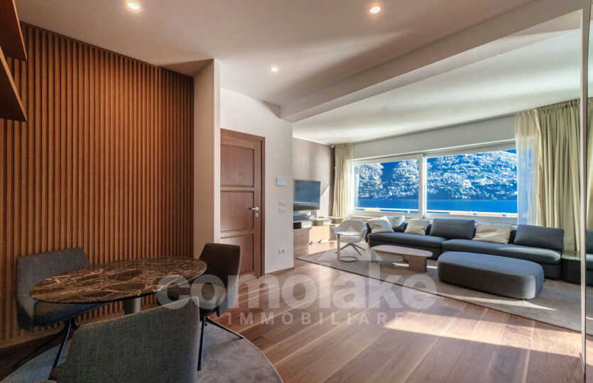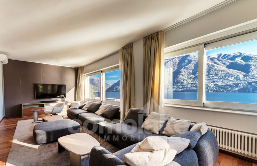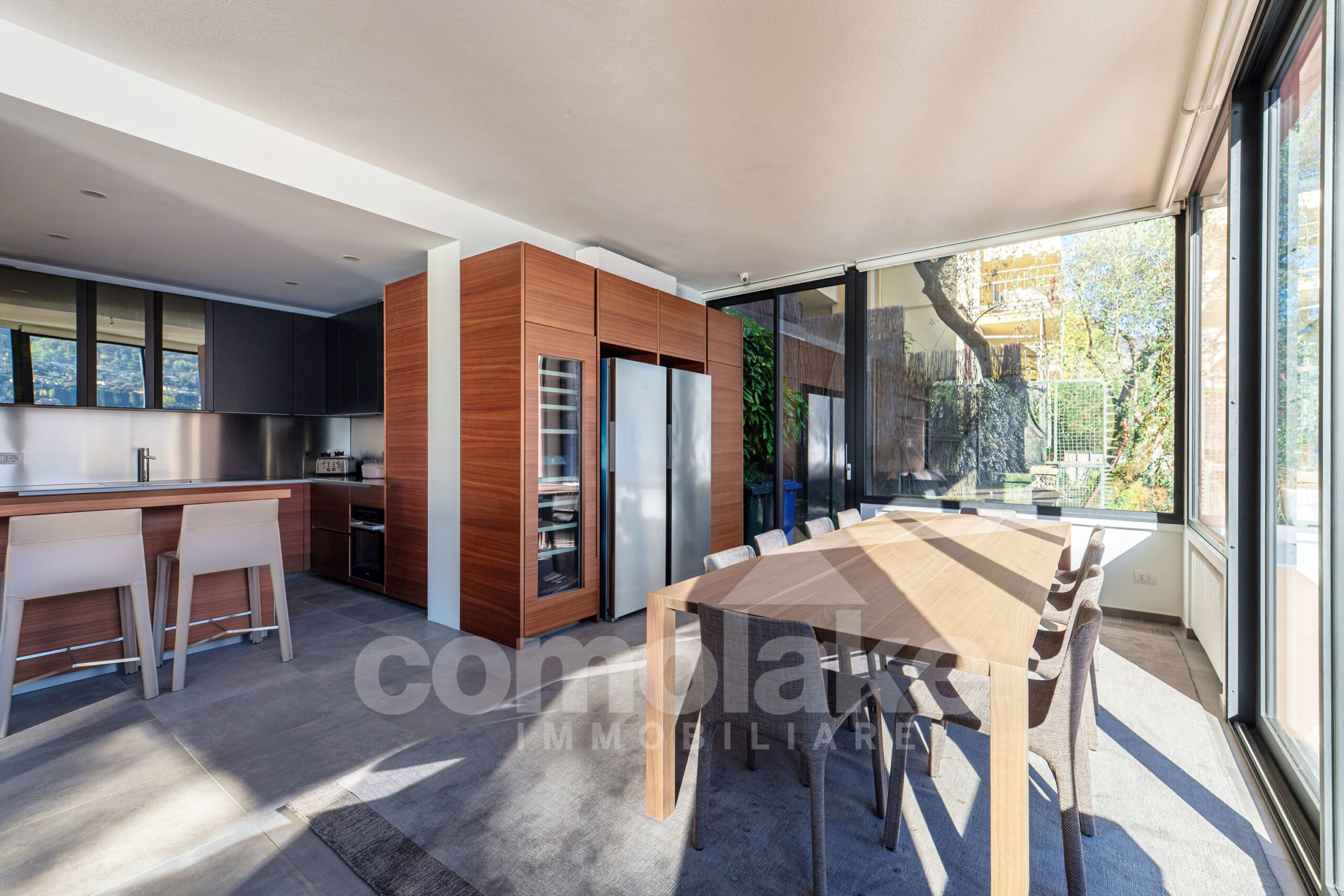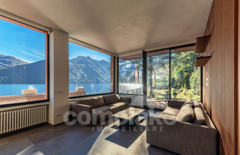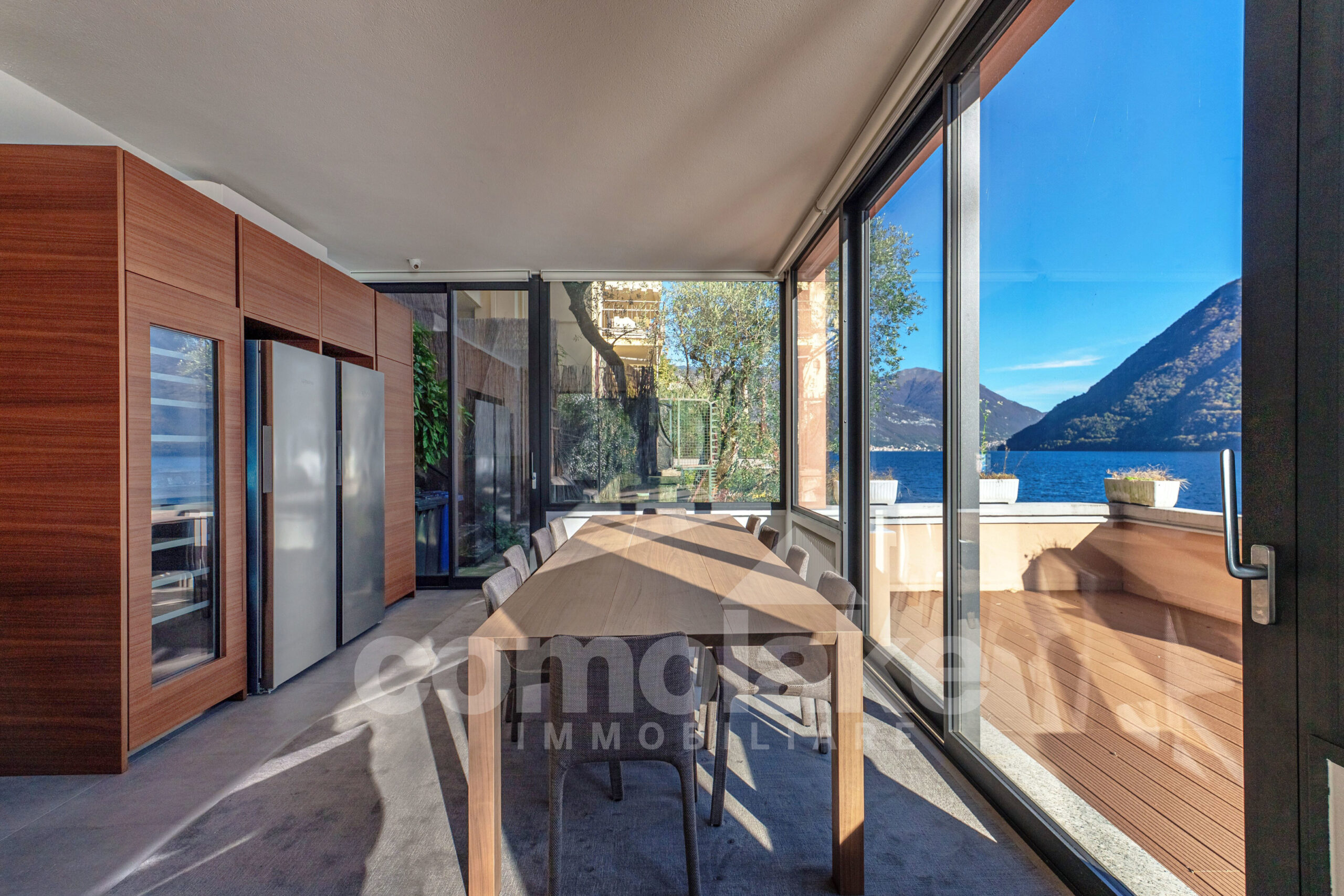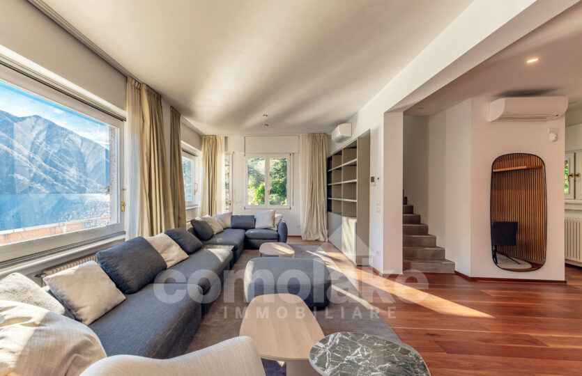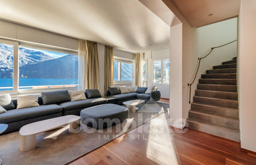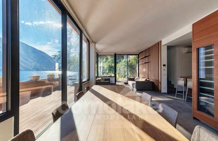 The modern lakefront villa with a large garden enjoys an exclusive location with plenty of privacy. The interiors are spacious and filled with natural light, and the renovation project was designed to respect the natural surroundings of the villa, offering stunning views of both the lake and the typical vegetation of the area. The flooring and furnishings create continuity between indoor and outdoor spaces, generating a natural and relaxing atmosphere.