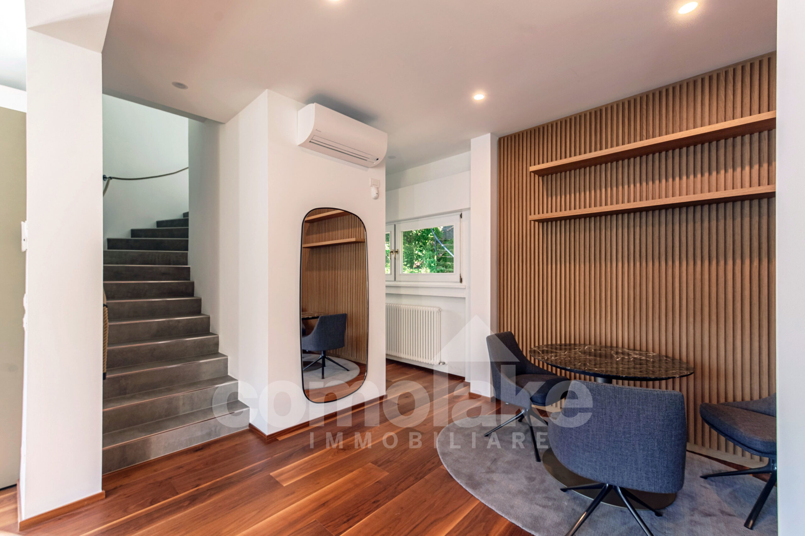 On the middle floor, where the main entrance is located, the modern lakefront villa with a large garden offers a bright and welcoming area for hosting guests, enriched by a home office space furnished with contemporary design elements. The modern-style wood paneling on the walls echoes the tones of the lake, creating a seamless harmony between indoors and outdoors.