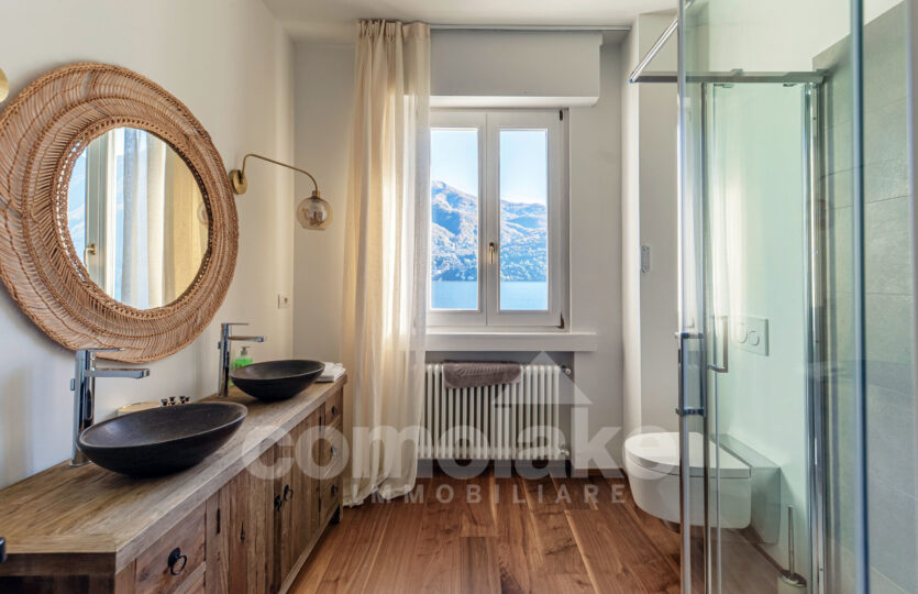 All the bathrooms are modern and functional, designed with materials and color palettes inspired by the lake’s atmosphere, contributing to the villa’s overall sense of harmony.