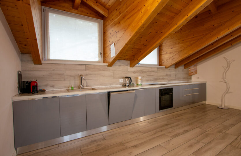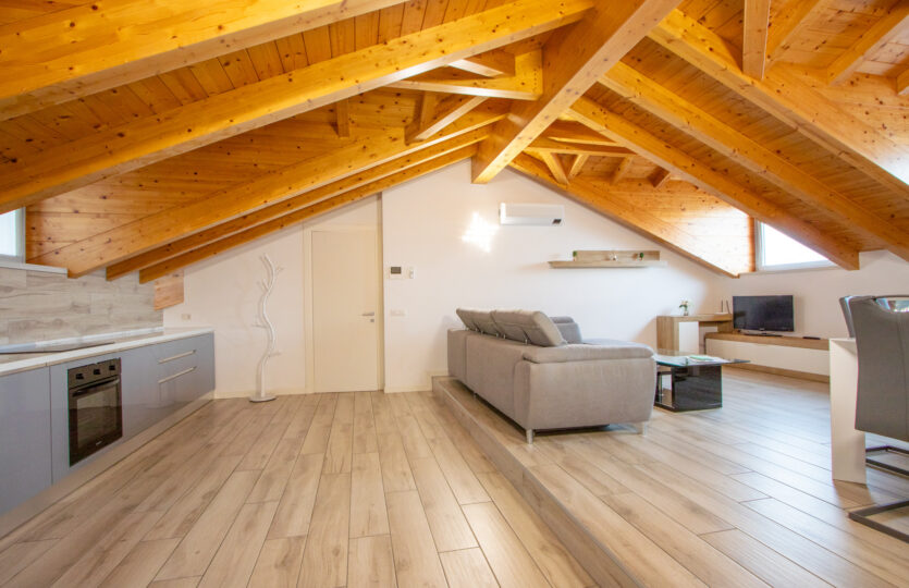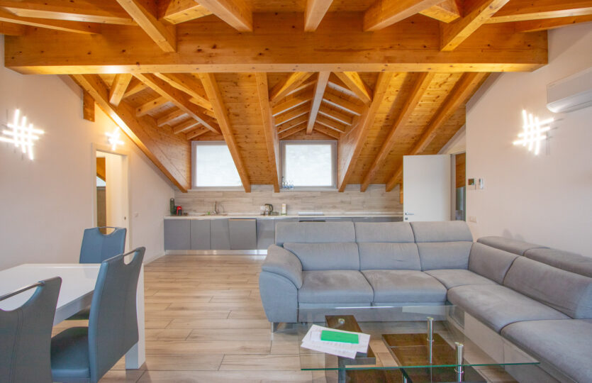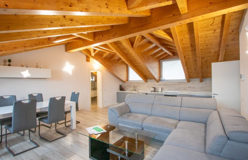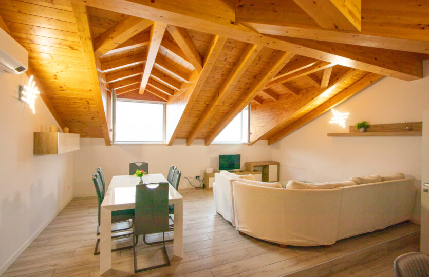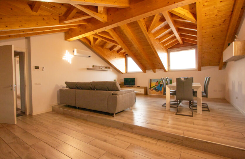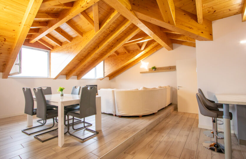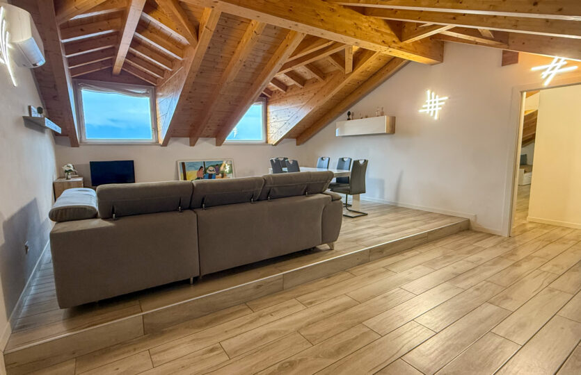 - 120 m² penthouse apartment comprising: entrance hall, large living room with open kitchen, bathroom, 2 bedrooms, one of which is very large with private bathroom and wardrobe. Single garage and complete existing furnishings;