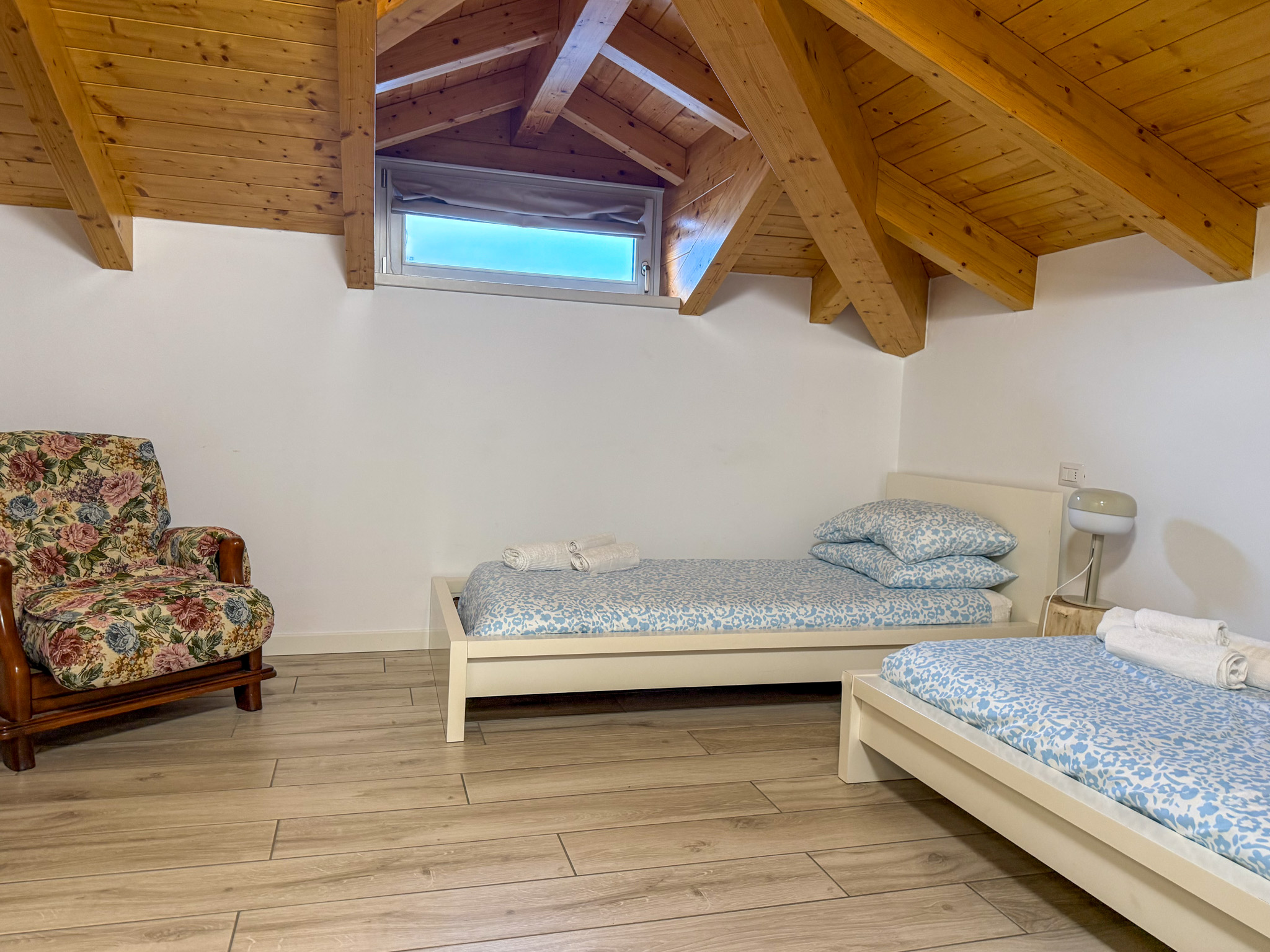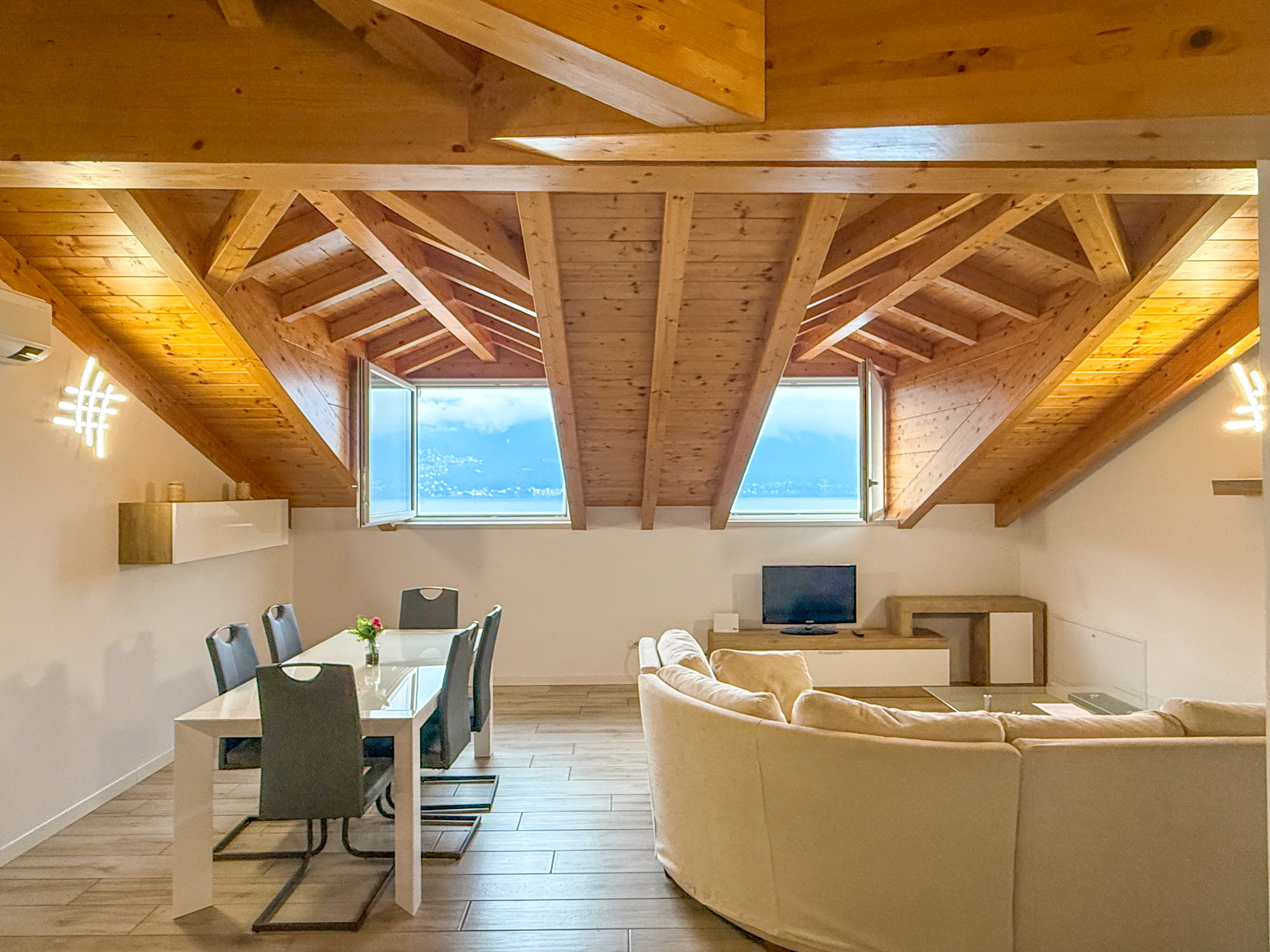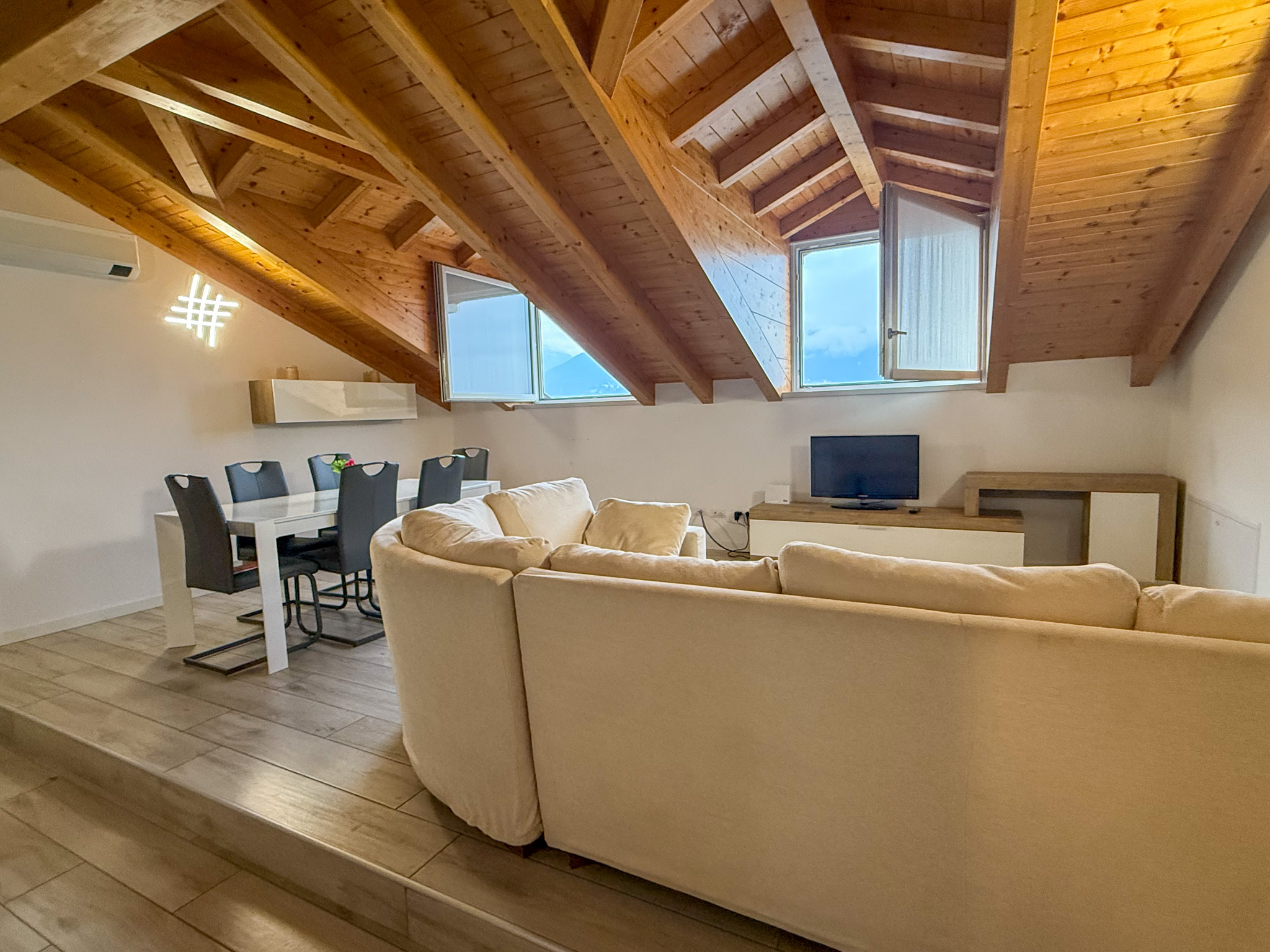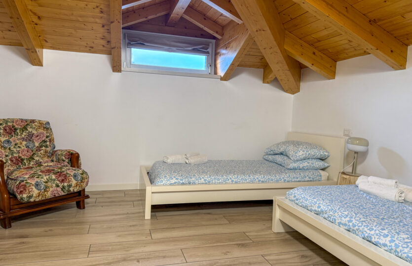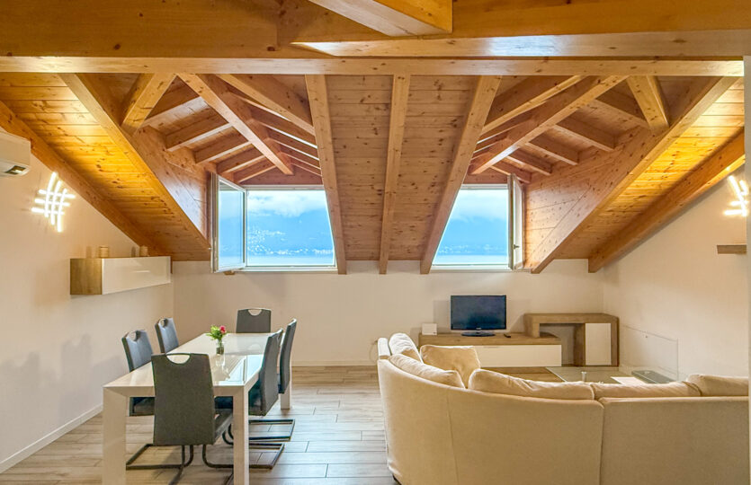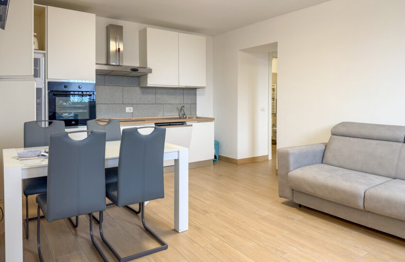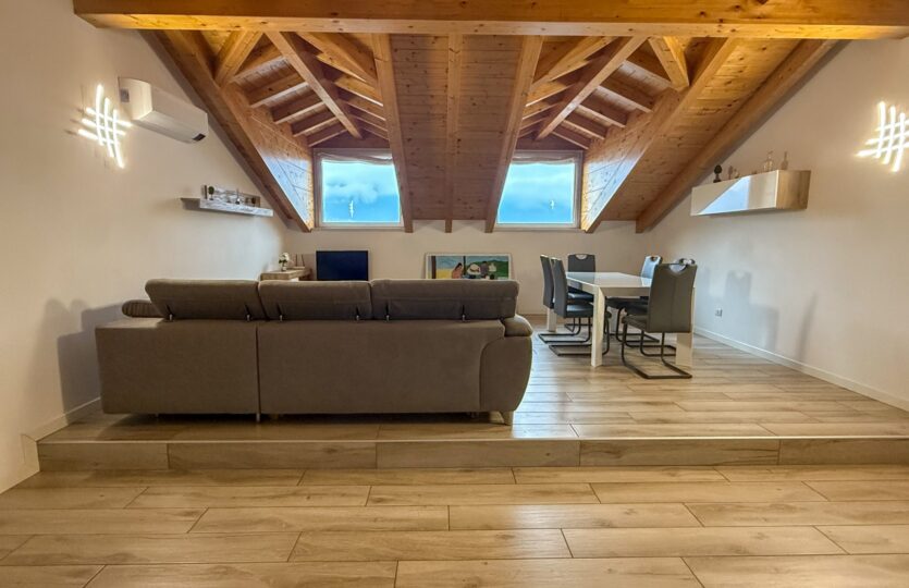 - 110 m² penthouse apartment comprising: entrance hall, large living room with open kitchen, 2 bedrooms, wardrobe, and bathroom. Single garage and complete existing furnishings;