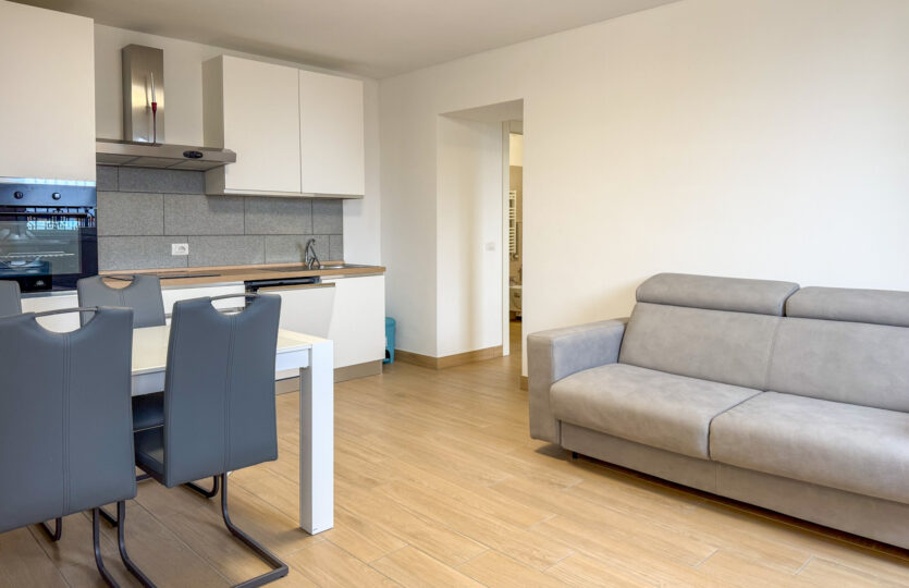 - 50 m² ground floor apartment comprising: entrance hall, living room with open kitchen, bedroom, and bathroom. Uncovered parking space and existing furnishings.