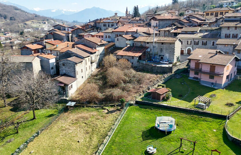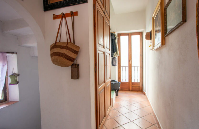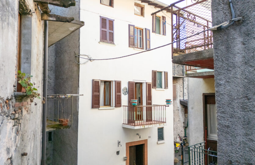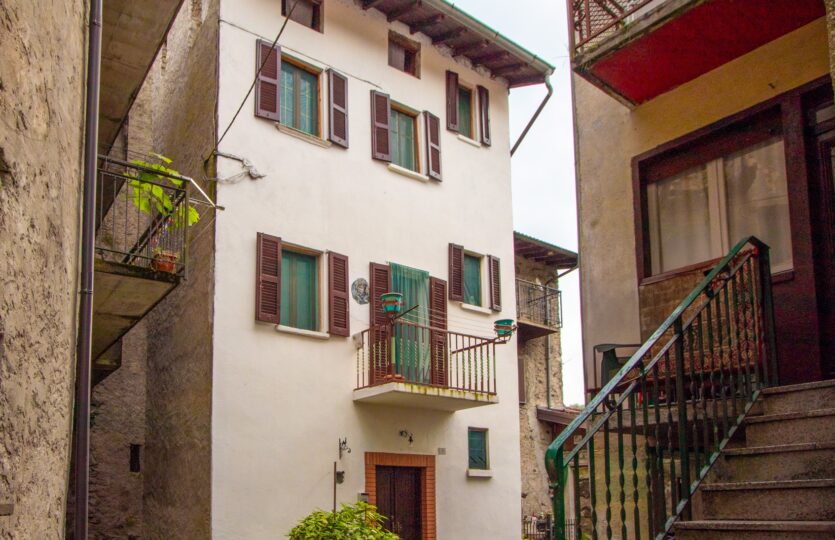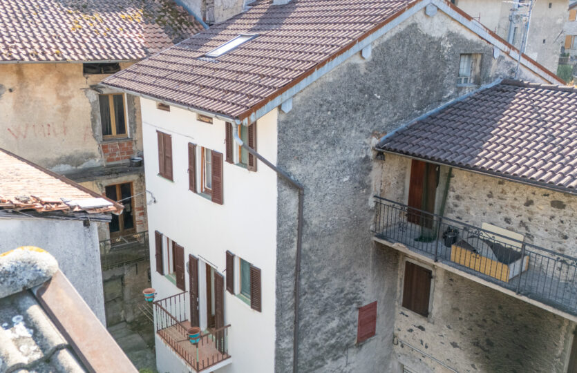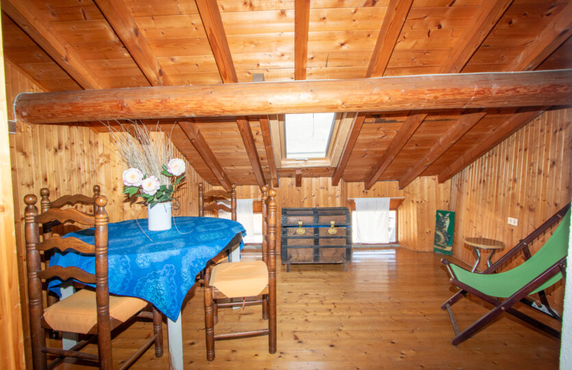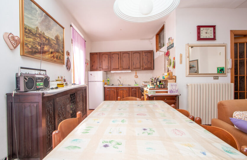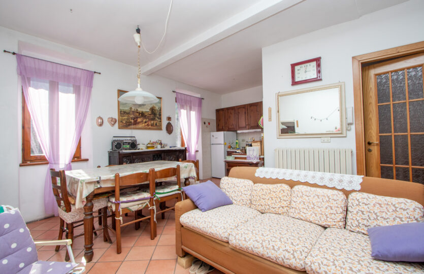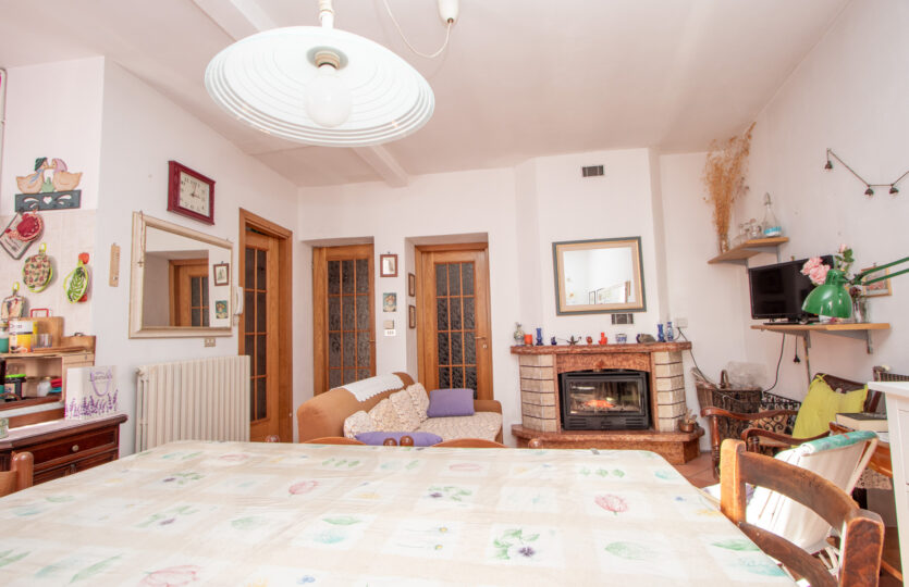 – piano primo: luminoso soggiorno con camino e cucina a vista, camera, bagno e balcone;