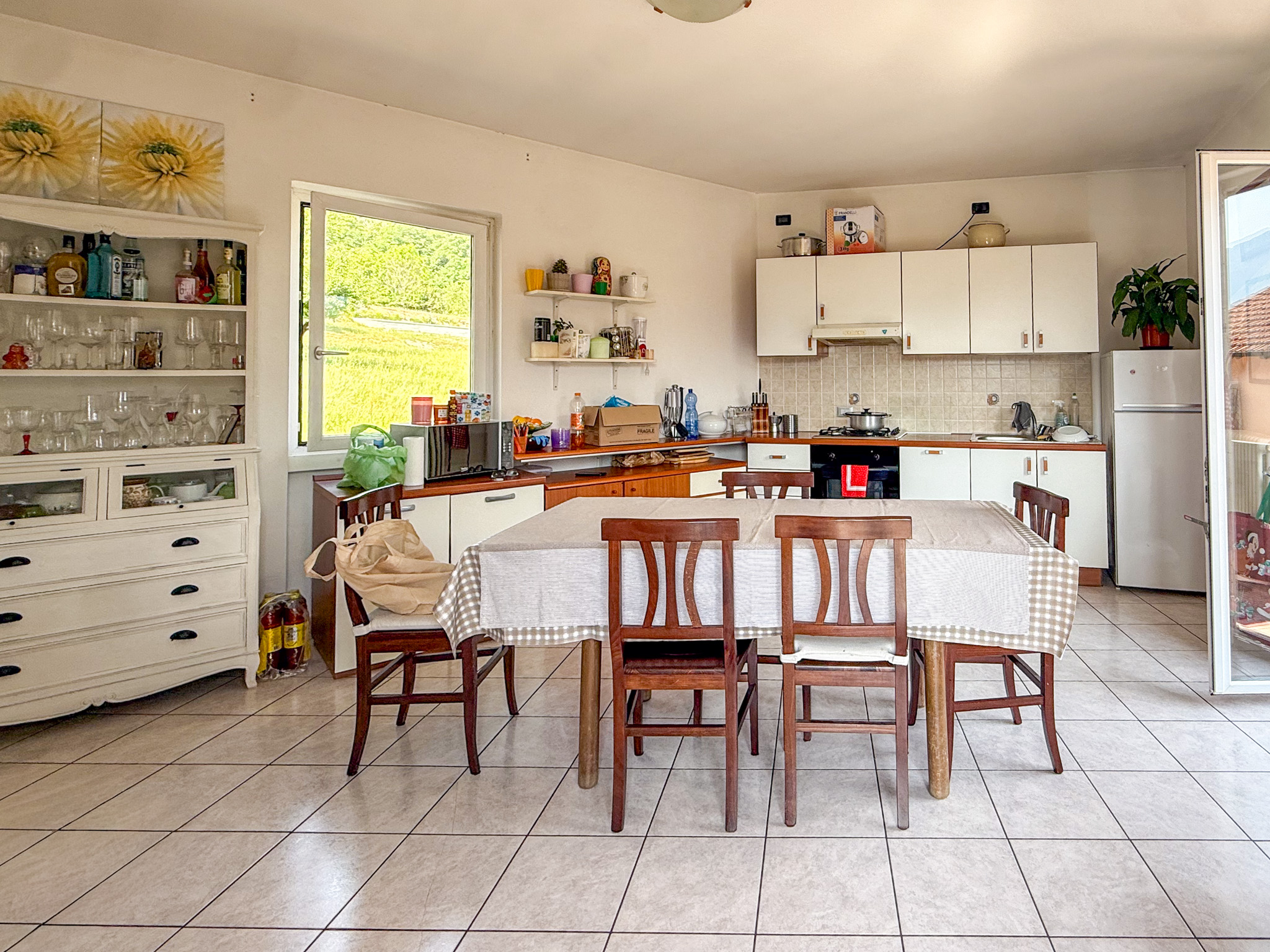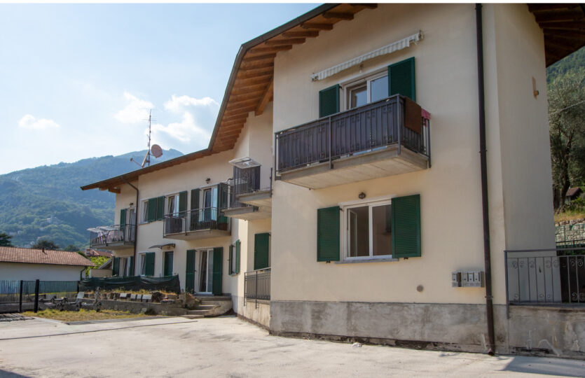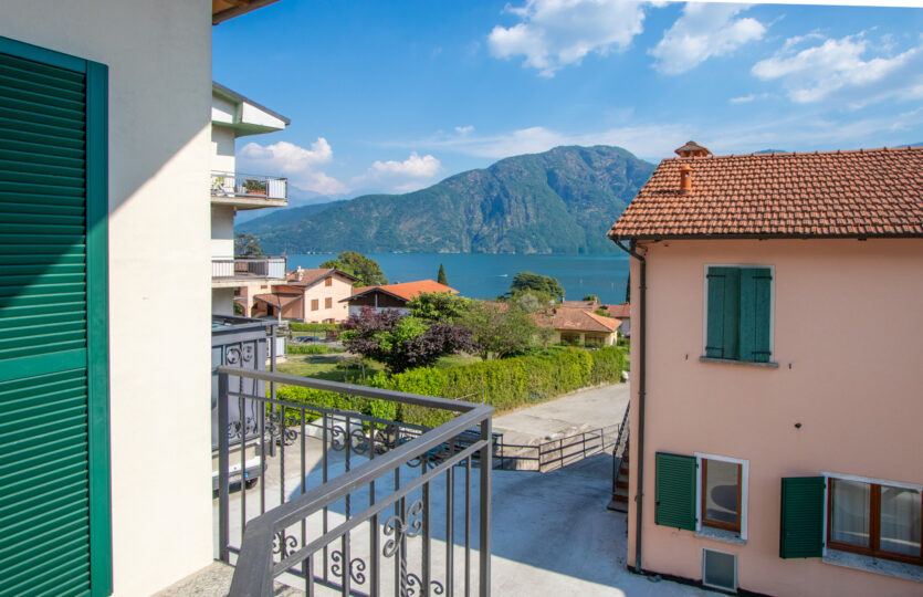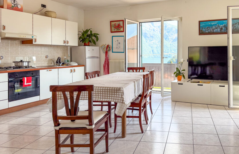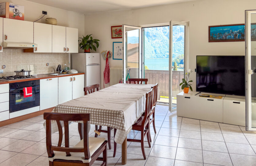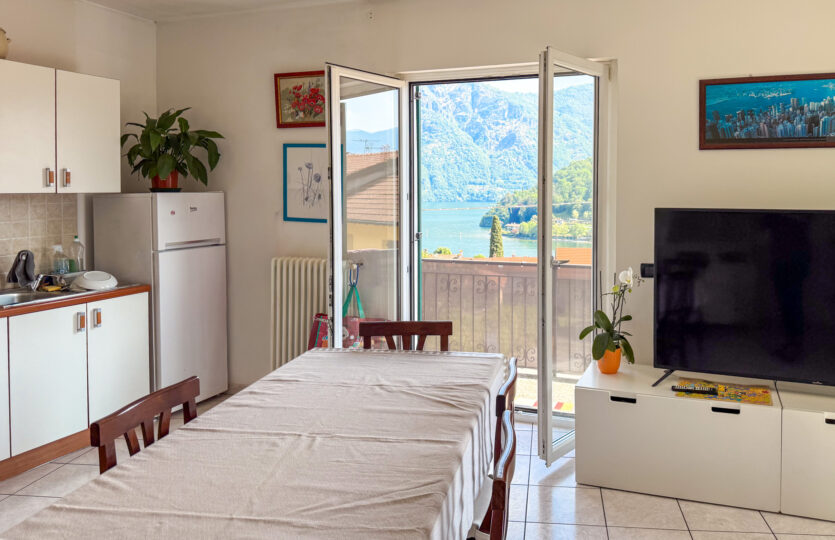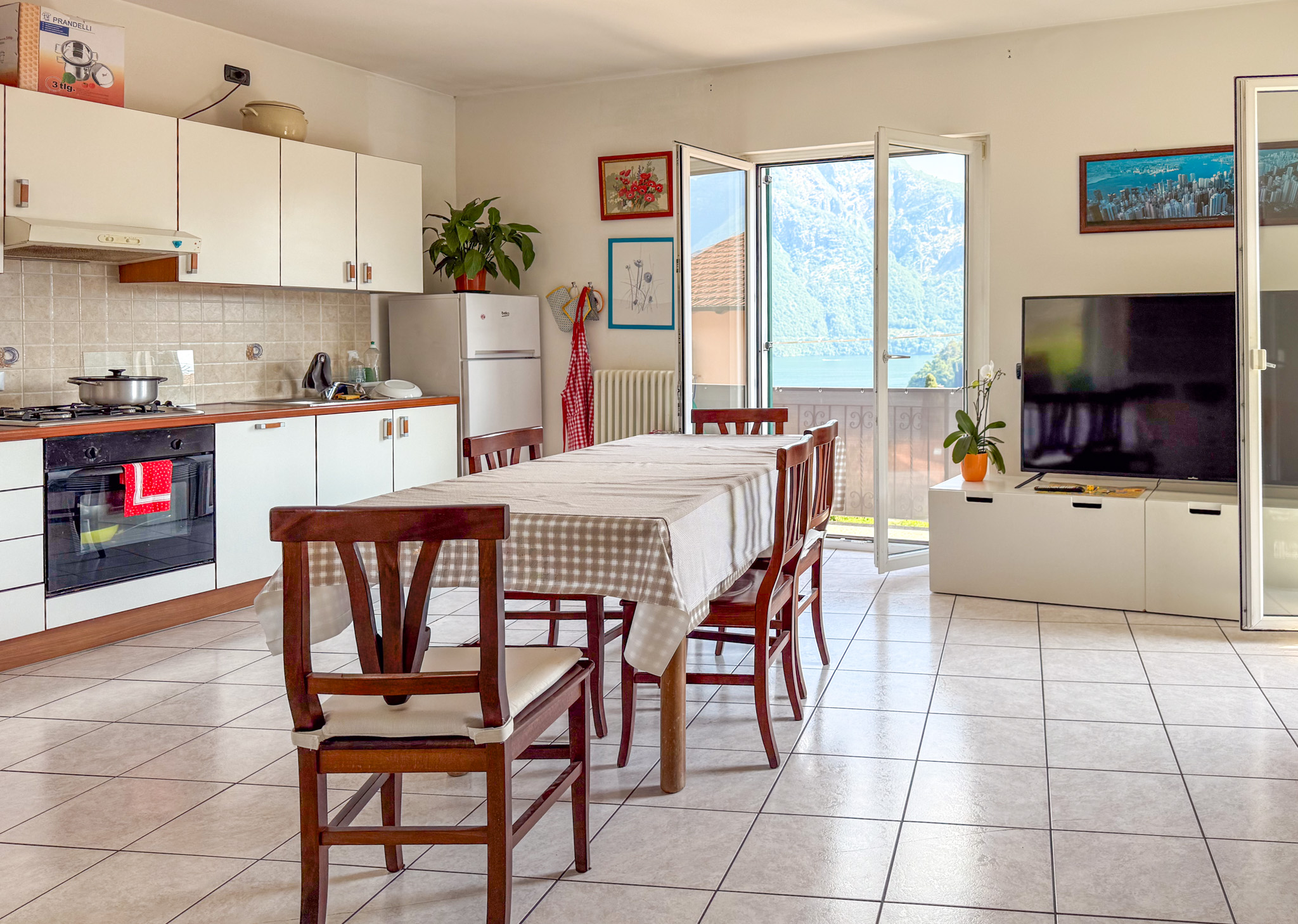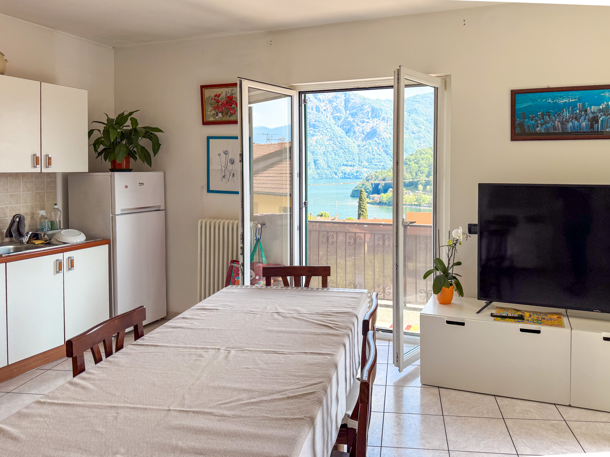 L’appartamento è sito a primo ed ultimo piano ed è composto da: ingresso, grande soggiorno con cucina a vista e terrazzo con vista lago, due camere matrimoniali di cui una con uscita su terrazzo, e bagno. Inoltre posto auto scoperto di proprietà.