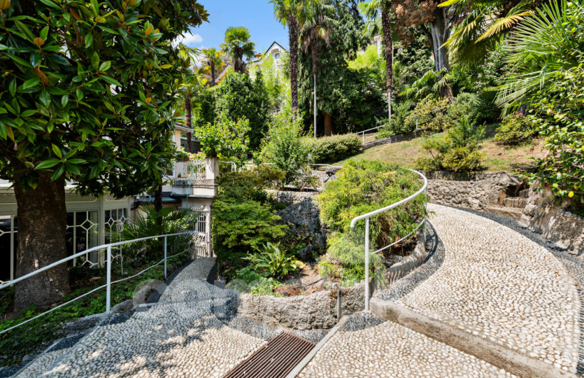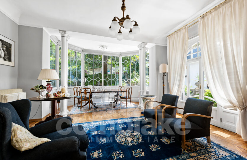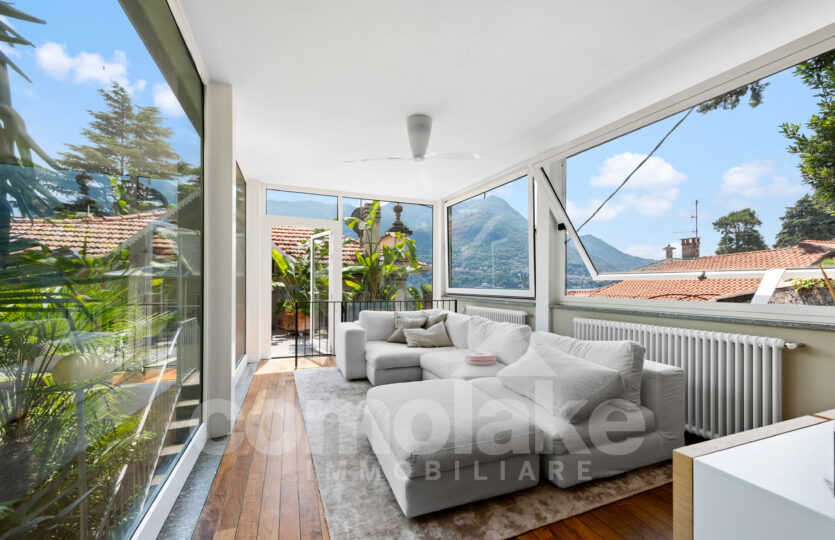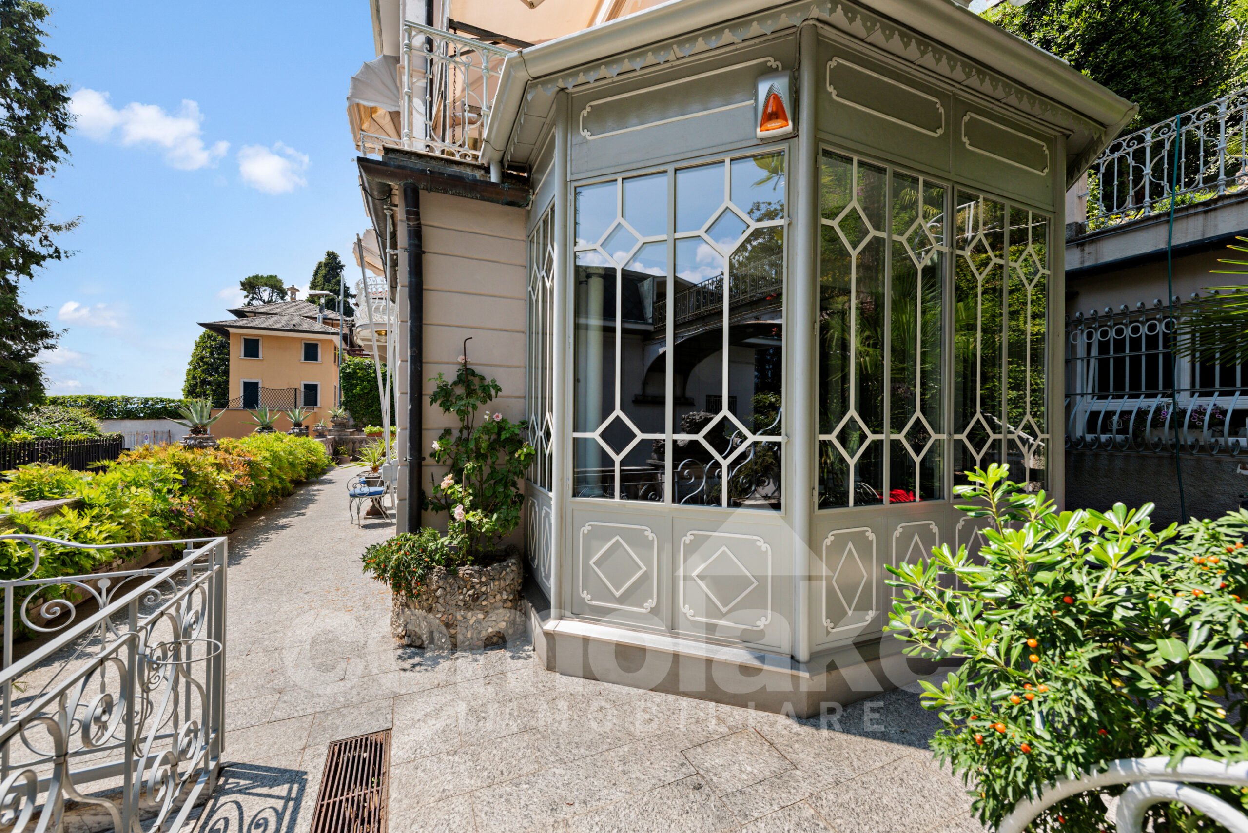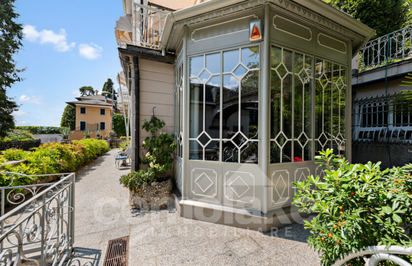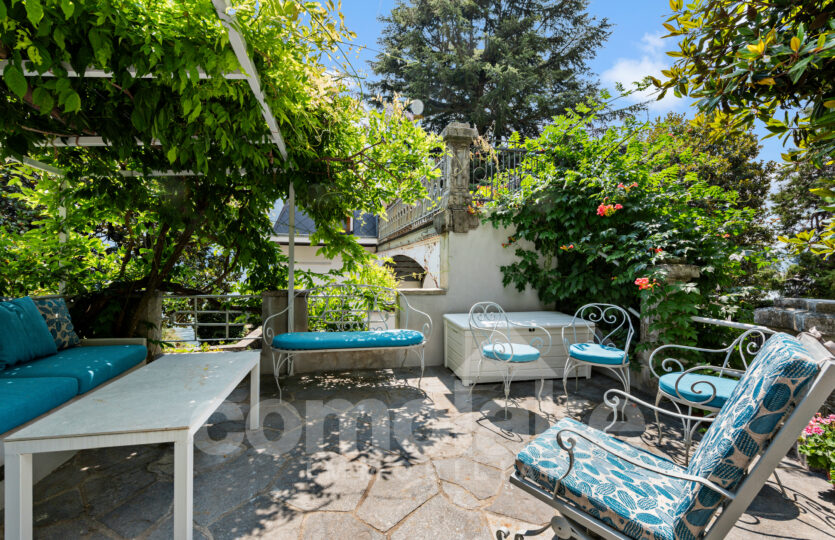 Gli ampi terrazzi evetrate della villa d’epoca vicino a Cernobbio ne garantiscono la luminosità e la vista. Inoltre, intorno alla proprietà vi è un bellissimo giardino all’inglese di 450mq dove rilassarsi all’ombra nelle calde giornate estive o organizzare cene e pranzi in compagnia sotto il romantico pergolato di glicine.