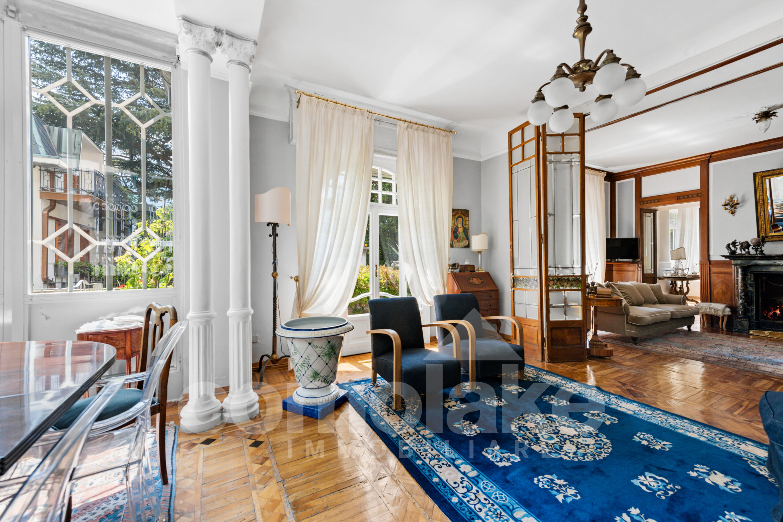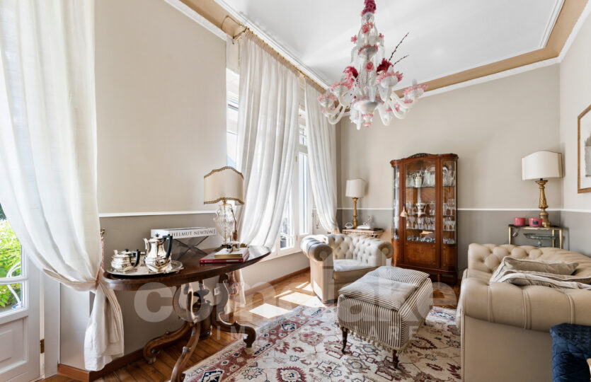 Dall’ingresso della proprietà si accede all’ampio soggiorno con camino e pregiato parquet, passando poi all’elegante sala da pranzo resa luminosa dalle vetrate, che affaccia su un ampio terrazzo; sullo stesso piano anche il salotto con vetrata in stile liberty, dove potere godere di momenti di relax in un’atmosfera d’altri tempi. E’ presente inoltre la cucina abitabile ed un bagno di servizio.