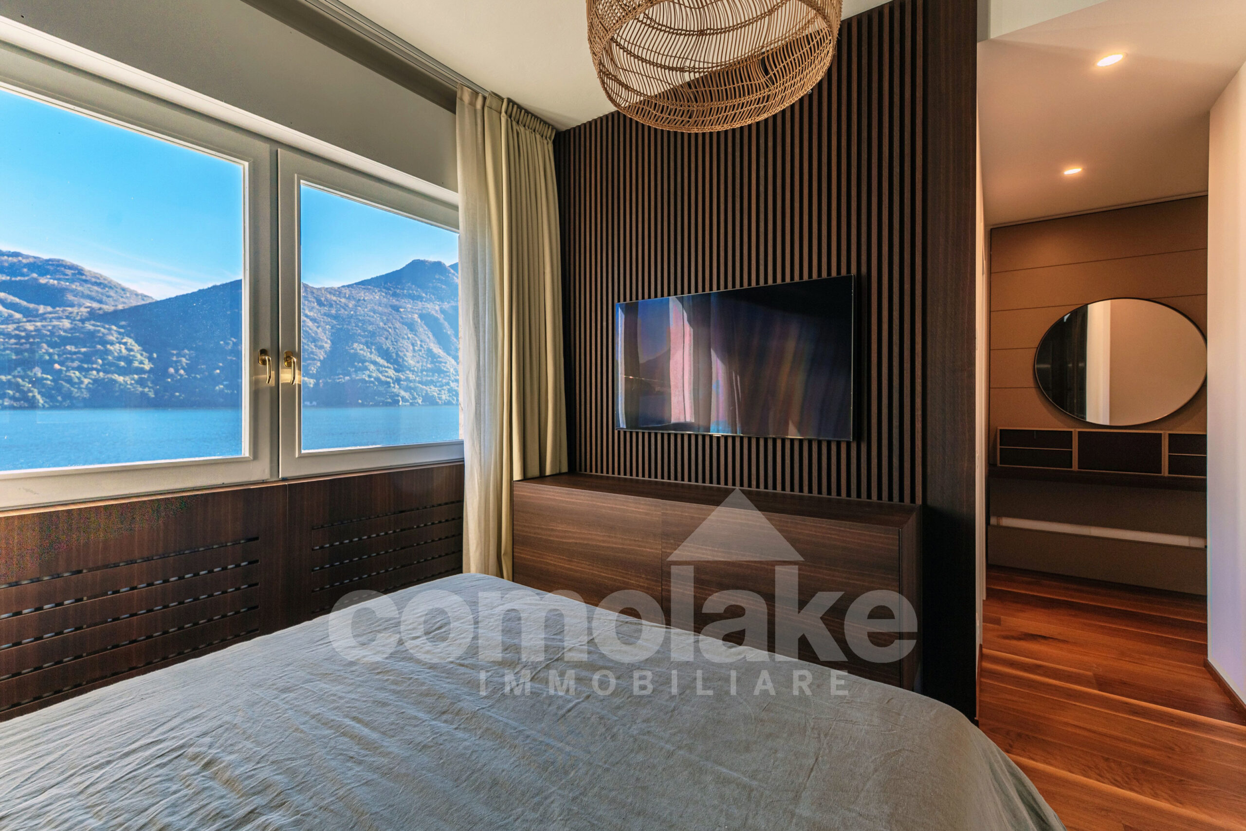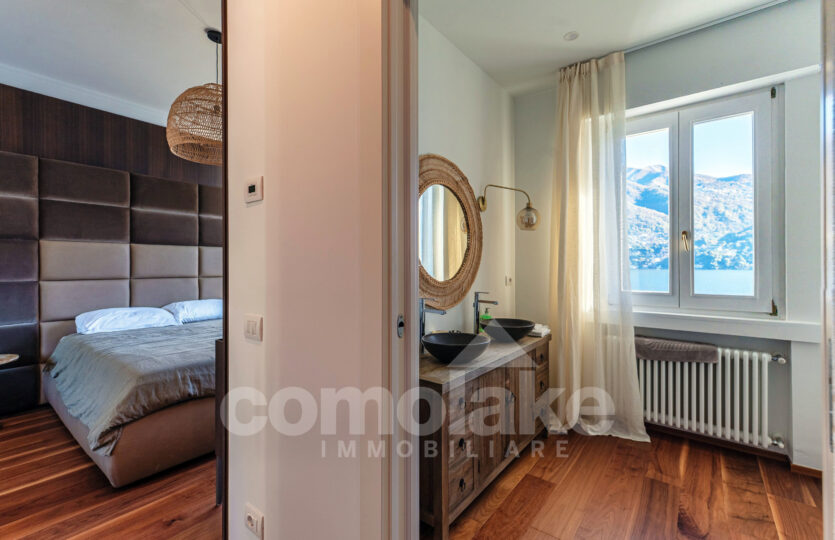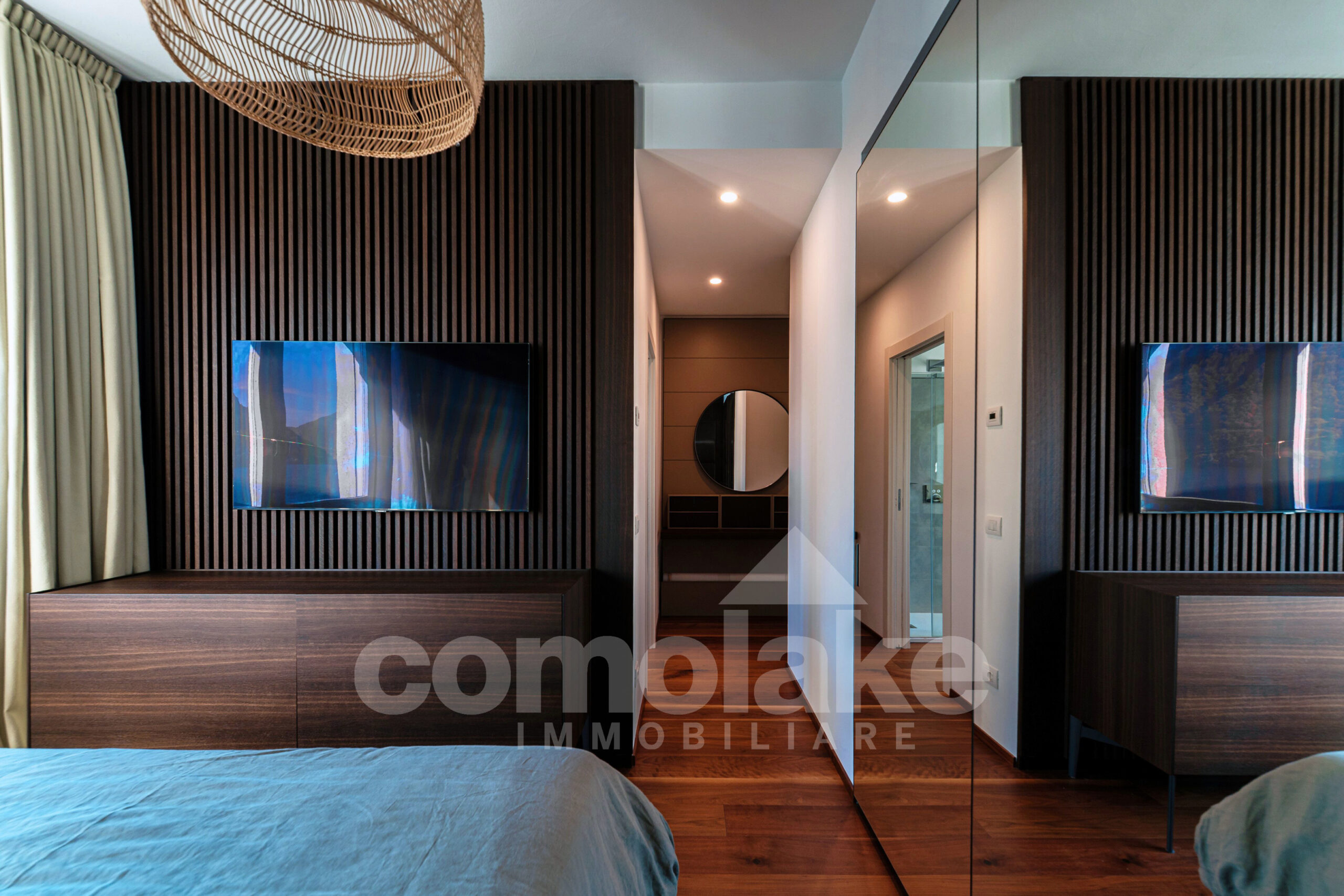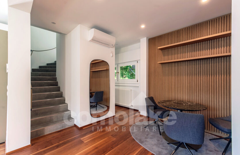 Al piano intermedio, dove si ha l’accesso principale, la villa moderna a lago con ampio giardino dispone di un ambiente luminoso e accogliente per ricevere gli ospiti, arricchito da uno spazio office arredato con elementi di design contemporaneo. Le pareti rivestite in boiserie in legno di gusto moderno dialogano con le tonalità del lago, creando una perfetta continuità tra interno ed esterno. L’area al piano superiore è organizzata con tre comode camere da letto, tutte con guardaroba e bagno privato, inclusa una raffinata suite padronale. Tutti i bagni, moderni e funzionali, sono stati progettati con materiali e tonalità che richiamano l’atmosfera lacustre e contribuiscono al senso di armonia complessivo della villa.