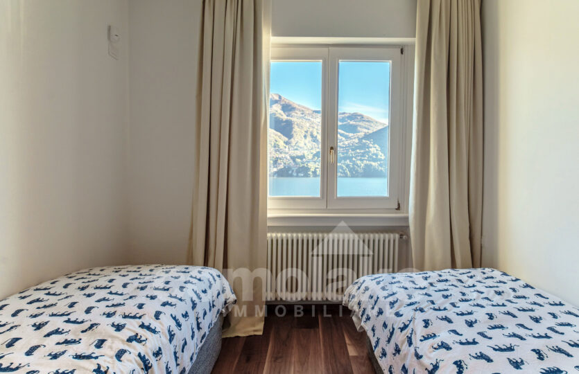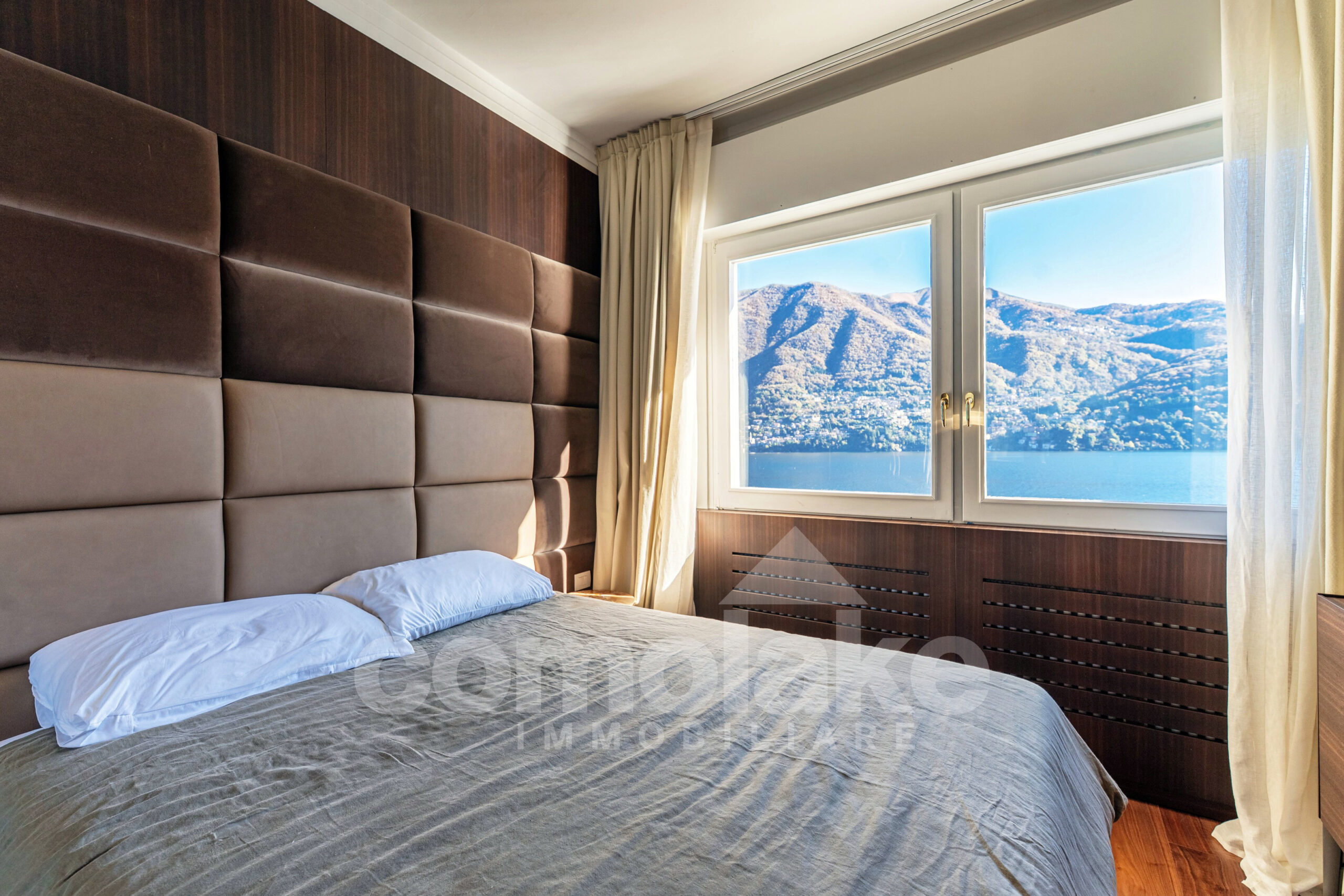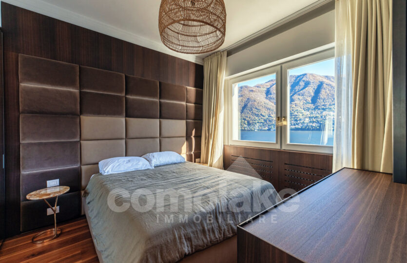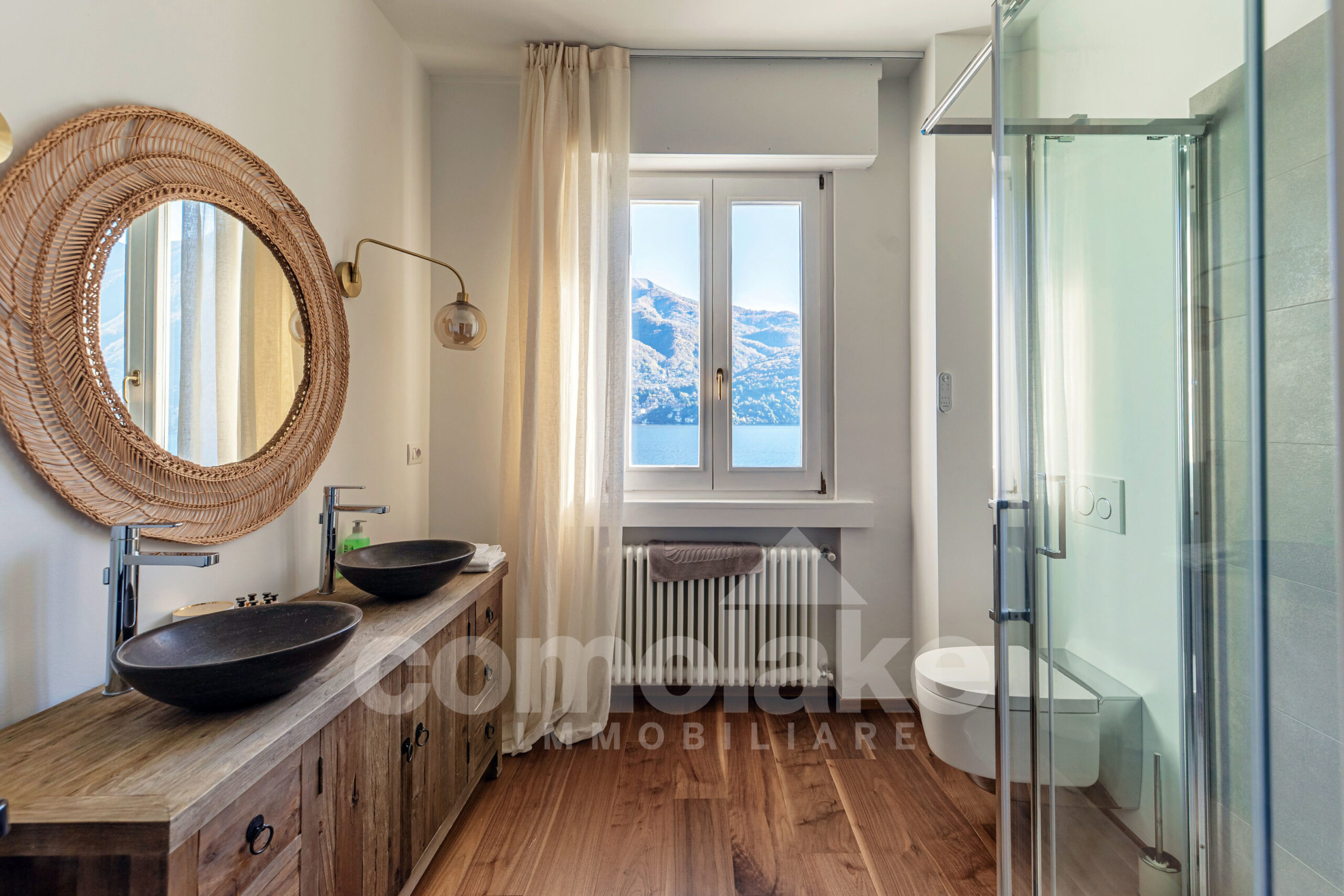 Al piano intermedio, dove si ha l’accesso principale, la villa moderna a lago con ampio giardino dispone di un ambiente luminoso e accogliente per ricevere gli ospiti, arricchito da uno spazio office arredato con elementi di design contemporaneo. Le pareti rivestite in boiserie in legno di gusto moderno dialogano con le tonalità del lago, creando una perfetta continuità tra interno ed esterno. L’area al piano superiore è organizzata con tre comode camere da letto, tutte con guardaroba e bagno privato, inclusa una raffinata suite padronale. Tutti i bagni, moderni e funzionali, sono stati progettati con materiali e tonalità che richiamano l’atmosfera lacustre e contribuiscono al senso di armonia complessivo della villa.