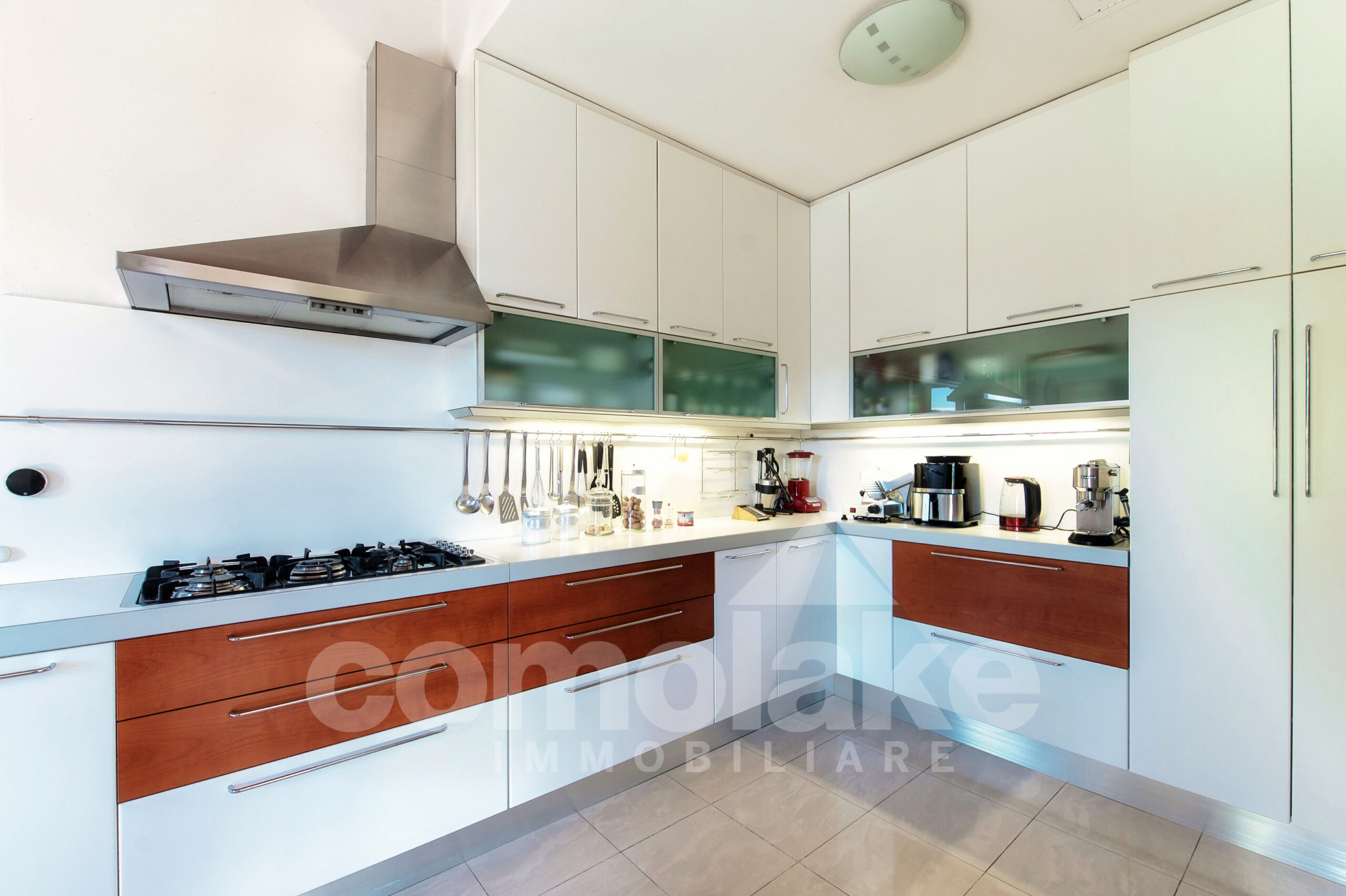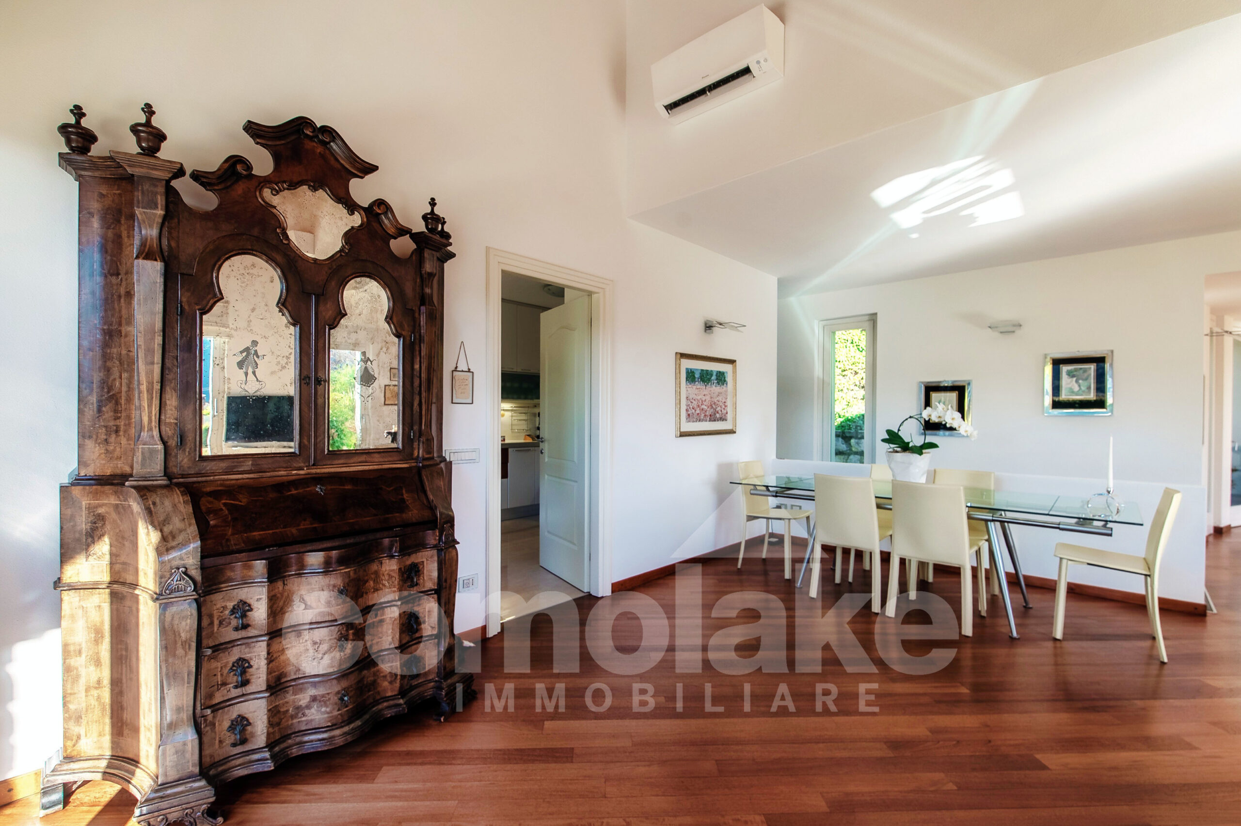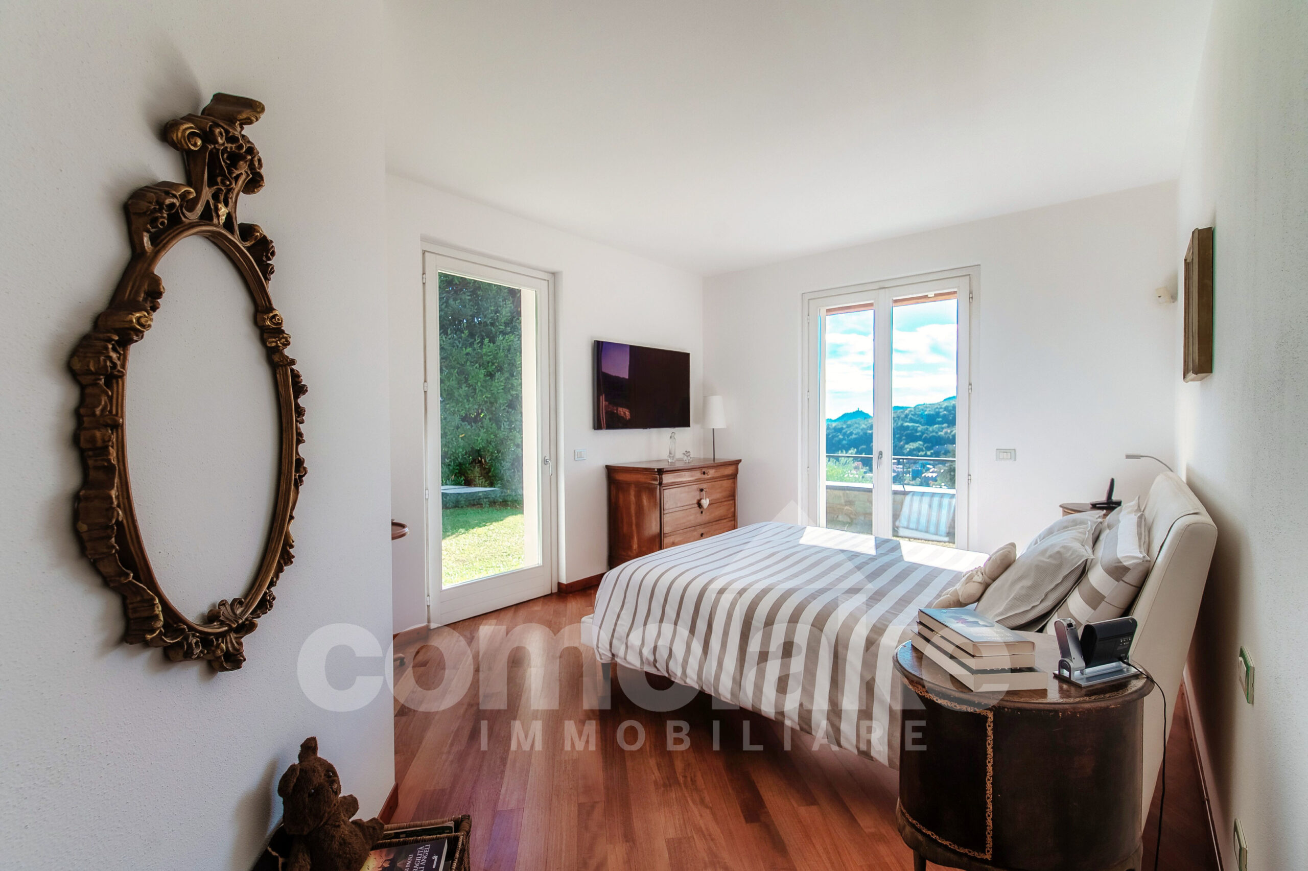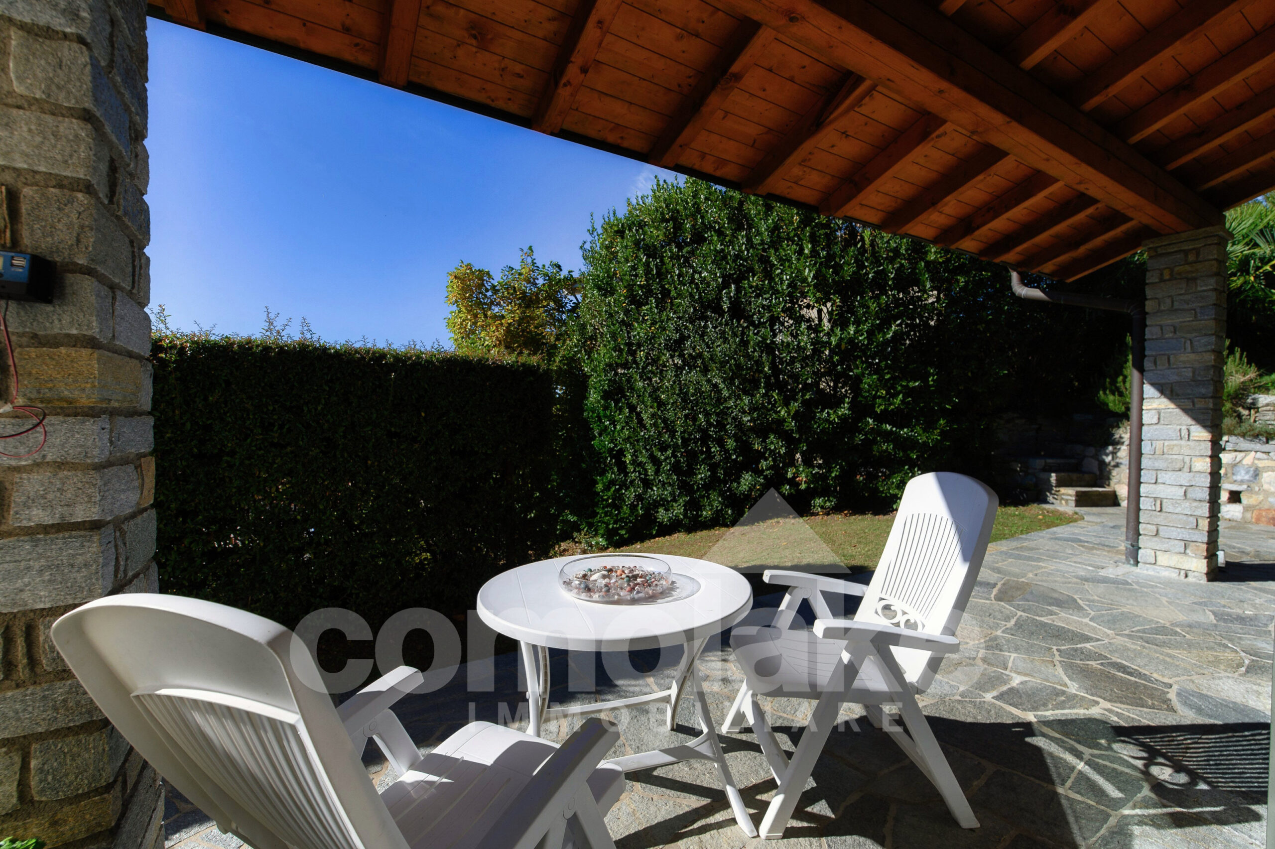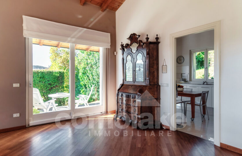 Progettata in chiave moderna e funzionale, la villa interpreta in modo contemporaneo lo stile classico delle dimore del lago. Le murature in pietra, le grandi finestre con persiane a battente e i pavimenti in parquet pregiato conferiscono alla casa un’eleganza accogliente. Al piano terra della villa moderna con giardino e vista lago si accede attraverso l’ingresso pedonale che introduce nel curato giardino pianeggiante. Su questo livello si trovano un ampio soggiorno con zona pranzo, una spaziosa cucina abitabile e un luminoso ambiente dedicato ad hobby e svago, ideale anche come area fitness o come unità indipendente per gli ospiti. Completa il piano una lavanderia pratica e ben organizzata. Una comoda scala conduce al livello superiore, dove si sviluppano tre camere con bagno, tra cui una suite con bagno privato e cabina armadio. All’ultimo piano si apre una raffinata camera matrimoniale con bagno en suite, intima e accogliente, dalla quale si accede a un’area privata del giardino con vista suggestiva sul primo bacino del lago. Al piano interrato un’ampia autorimessa ospita comodamente fino a cinque auto, con accesso diretto dalla strada principale.